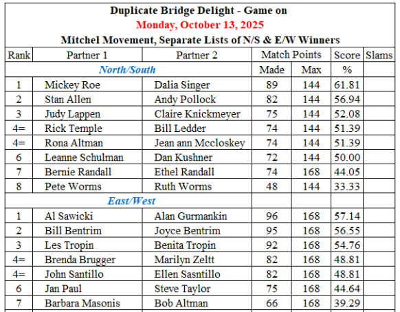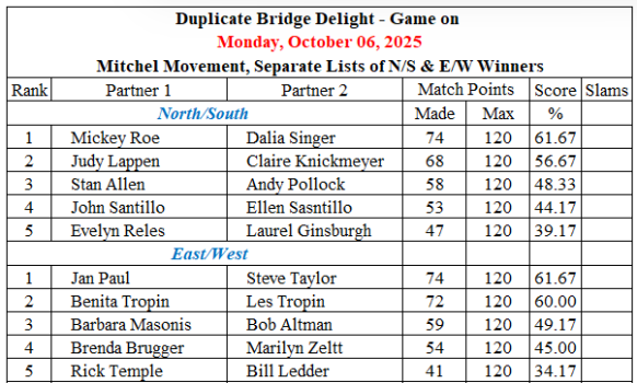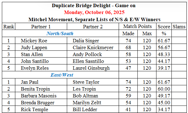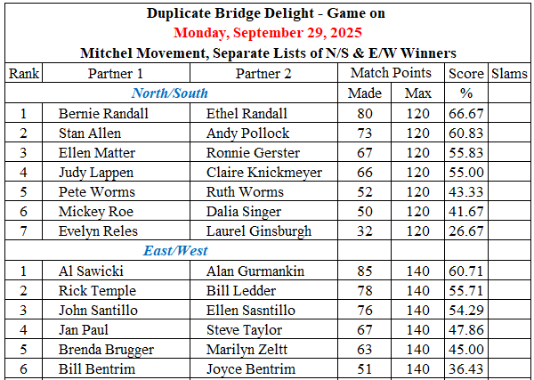 A duplicate bridge group who enjoy the social & competitive aspects of the game. Scores are e-mailed to club members and are posted below. Contact John Santillo (267-387-8598) for information.