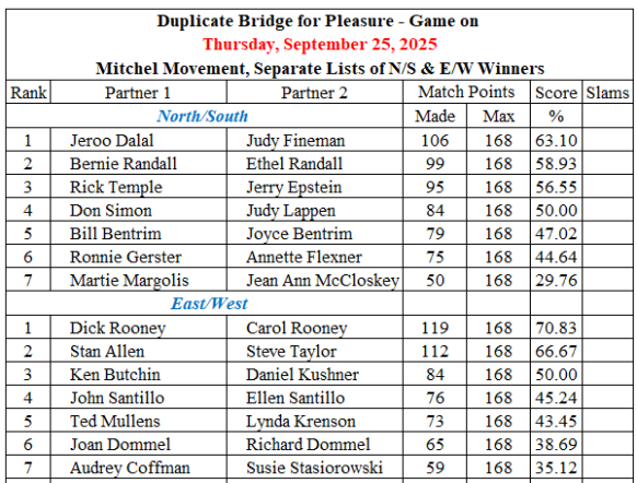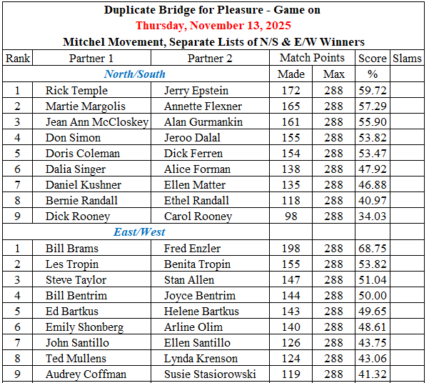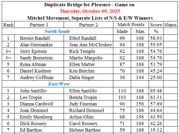 Duplicate bridge for enjoyment in a casual atmosphere Scores are E-mailed to all players and are posted below.