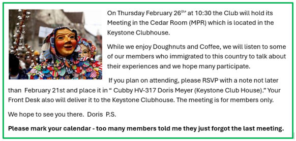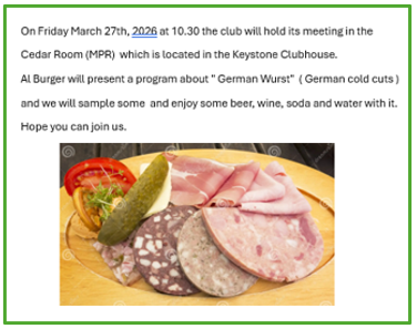 The German Club meets every 4th Friday at 10.30AM in the |