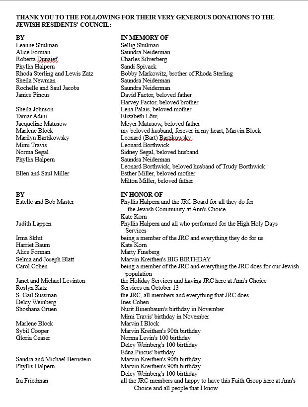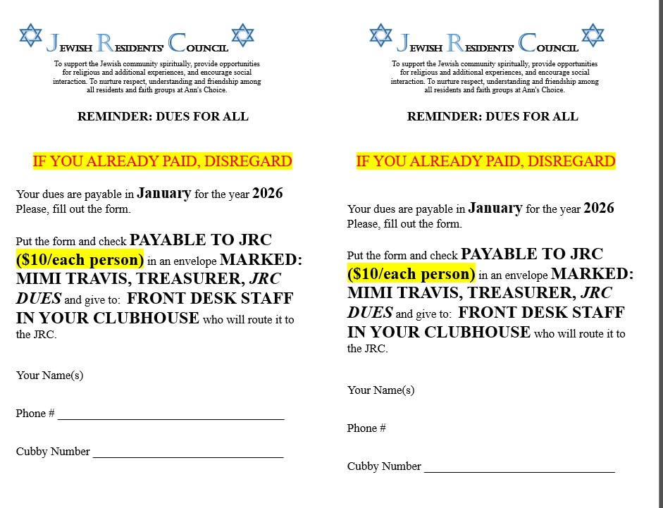 On the second and fourth Mondays, the class is led by resident Michael Kaplan until about 3:30. We study the portion of the week and holidays as well. The listings are in the JRC newsletter and the Ann's Choice calendar.