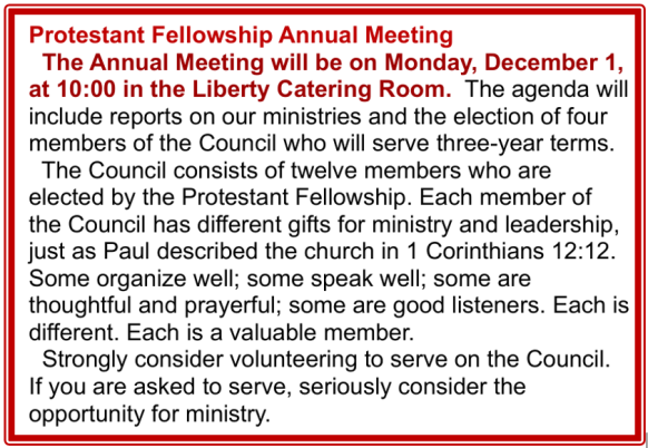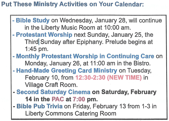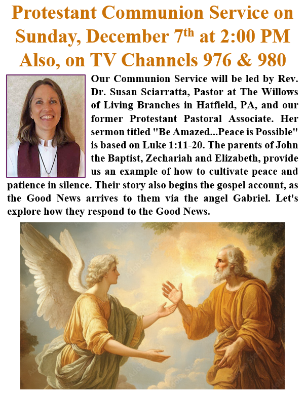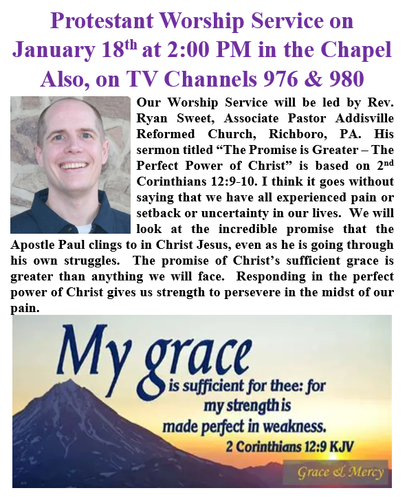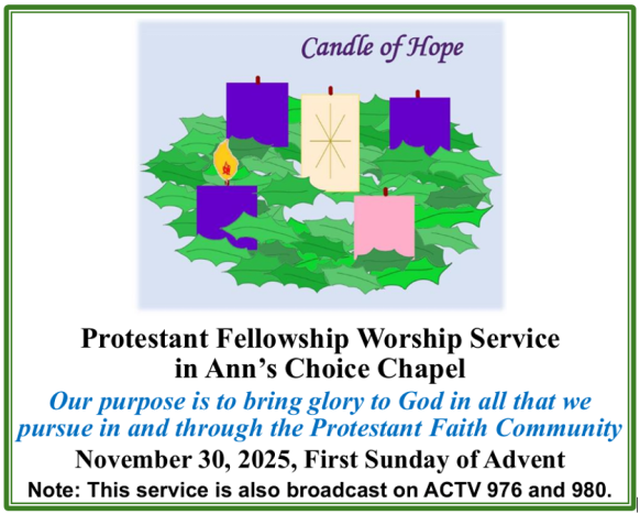 We would appreciate your comments, questions and suggestions below about the Protestant Worship Services in the Ann’s Choice Chapel on Sunday afternoons, about the bulletins and hymns, about the broadcasts of the services on the Chapel Channel ACTV 980 or 976, and about the announcements video before and after the broadcasts. Send a note to Pastoral Ministries or click below to open and print a form for submission to Pastoral Ministries.