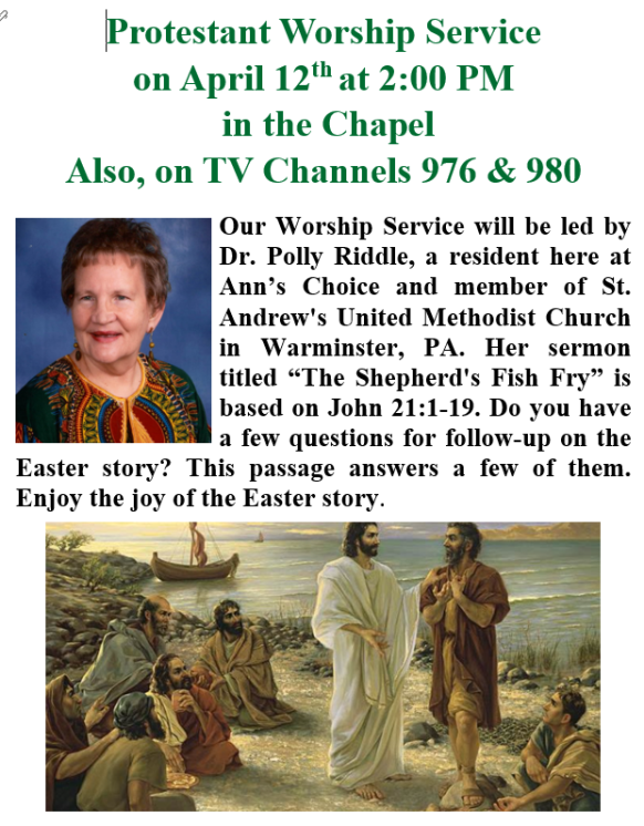“A Musical Journey from Palm Sunday to Easter”- A program of sacred music is presented by the Protestant Fellowship Council and Bud Williams plus scripture readings by Mary Lee Friesz and John Hodges and solos by Sharon Brand. Click here to view