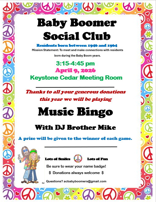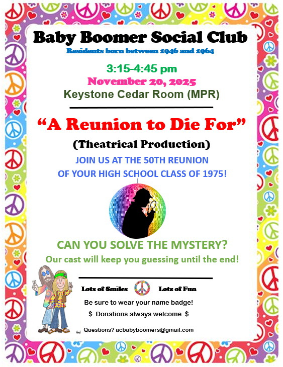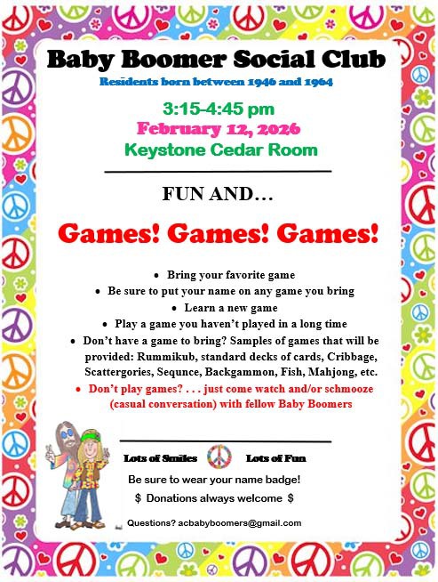 Purpose: To provide a regular time and place for the younger residents of Ann's Choice, born during the Baby Boom years, to connect and socialize. Residents born between 1946 and 1964 are considered part of the Baby Boomer Generation.