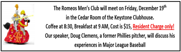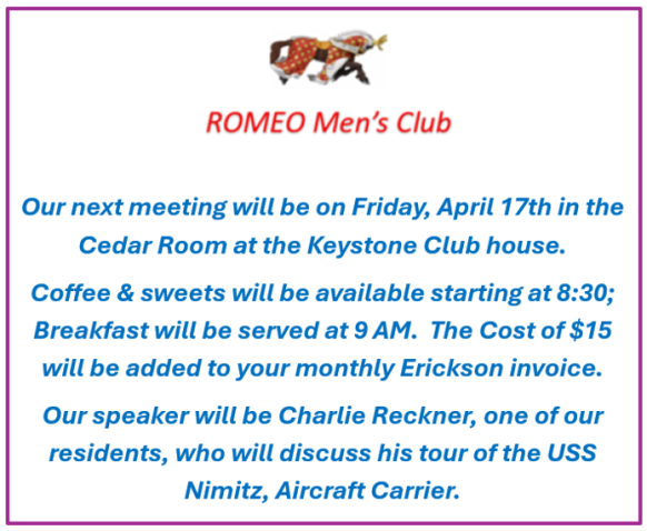 The Romeo Club of Ann’s Choice was founded in March, 2005 by the late Dr. Harry Smith, an Ann’s Choice resident. After the first breakfast meeting, those who attended established the Romeo culture of no fees, no dues, no constitution and no bylaws. In September, 2007, the club began meeting for a moderately priced breakfast at the nearby Vereinigung Erzgbirge, a restaurant and recreation club. Effective April, 2013, we moved to the Keystone Multi-Purpose Room at Ann's Choice. With the growth of membership to over 130, a more formal structure was required and the club, furthering its 16th century literary theme, adopted a mounted Knight of the Middle Ages for the club’s logo and named a Regent to lead the club together with a Minister for each of the club’s functions of Finance, Haberdashery, Trips and Travel, Records, Fellowship, Music and Mirth. In the last three years, Romeo members, after the breakfast meeting, have been entertained by a score of interesting speakers from Ann’s Choice and the community and have visited over 25 special sites (cathedrals, historical homes, museums, vineyard wineries, etc.).